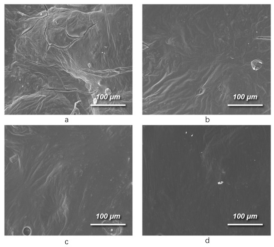 Figure 6 shows that, with the addition of modified additives, the dispersion of corn cob in the UF adhesive improves, resulting in a smoother surface after curing. Additionally, comparing the cured untreated corn cob with modified corn cob, it was observed that the untreated corn cob had obvious cracks and protrusions on the surface. However, with the addition of the modified additives, the dispersion of the modified corn cob in the adhesive improved, resulting in the disappearance of cracks and reduced protrusions on the surface of the cured adhesive. In particular, when both bentonite- and tannin-modified additives were added simultaneously, the surface of the cured adhesive became flat and smooth, indicating the best dispersion. Overall, both bentonite and tannin can improve the dispersion of corn cob in the urea–formaldehyde adhesive, and the best dispersion is achieved when both additives are used together.