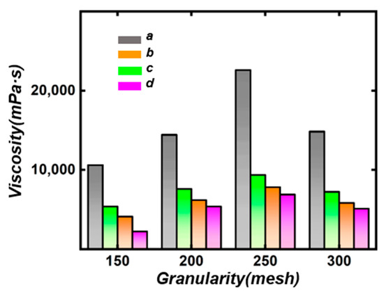 Effect of particle size on UF viscosity (a: untreated corn cob; b: bentonite-modified corn cob; c: tannin-modified corn cob; d: bentonite- + tannin-modified corn cob).