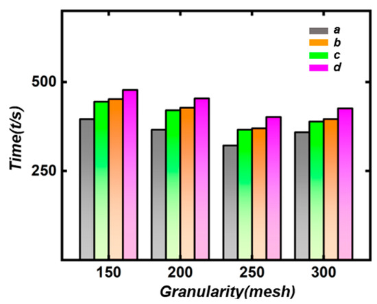 According to Figure 9, it can be observed that, when the addition amount is 20%, the curing time of UF adhesive filled with untreated and modified corn cob powders is longer than that of UF adhesive filled with flour. During the hot-pressing process of plywood, the pressing time should be appropriately extended to ensure the complete curing of the glue layer and to ensure the bonding strength of the plywood. As the particle size of untreated and modified corn cob powders decreases from 150 mesh to 250 mesh, the change trend of the UF adhesive is not significant, but overall it shows a decreasing and then increasing trend. When the particle size of untreated and modified corn cob powders is 250 mesh, the curing time of the UF adhesive is the shortest. After further reducing the particle size, the curing time of the UF adhesive slightly increases. Therefore, when the particle size of the powder is 250 mesh, it has the least impact on the curing time of the UF adhesive.