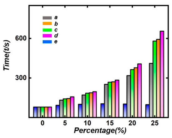 The curing time of the UF adhesive was studied after adding different proportions of untreated and modified corn cob powders, as well as flour, as fillers. The curing time results are shown in Figure 10. After adding untreated and modified corn cob powders, as well as flour, the curing time of the UF adhesive is longer compared to when no fillers are added. The curing time increases with the increasing addition of untreated and modified corn cob powders. However, the change is not significant with the increasing addition of flour. When the addition amount of flour reaches 25%, the curing time of the UF adhesive slightly decreases. It can be observed that flour, as a filler for urea–formaldehyde adhesive, provides a relatively stable curing time for the UF adhesive. In contrast, untreated and modified corn cob powders as fillers result in a longer curing time, indicating that they slow down the curing rate of the UF adhesive and effectively prevent premature curing. Among the modified corn cob powders, the combination of bentonite and tannin shows the most significant effect, suggesting that when bentonite and tannin are used as modification agents for corn cob powder as a filler for urea–formaldehyde adhesive, they have the best effect in preventing premature curing of the adhesive.