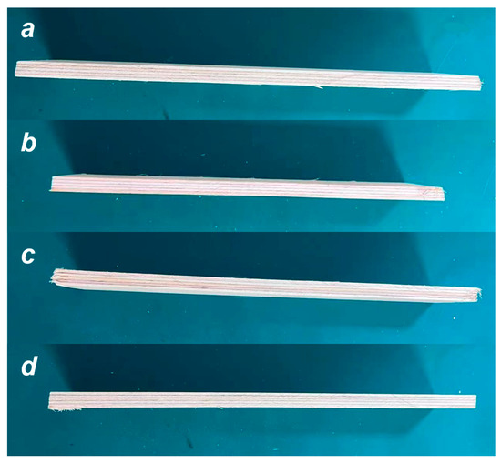 The pre-pressing effects of the four groups of specimens are shown in Figure 11. The results of the pre-pressing test of the plywood indicate that after being cold pressed for 60 min in the pre-press machine, all four panels achieved complete consolidation and could not be separated by hand. Additionally, after being left for 30 min, no delamination occurred, suggesting that the pre-pressing performance of the plywood prepared with modified fillers meets the requirements.