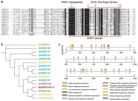 Sequence, phylogenetic, and promoter analysis of BpWRKY49. (a) Sequence alignment of BpWRKY49 with WRKYs from other species. Identical amino acids are shaded black. Red underline shows WRKY domain sequence, left red line with arrow above shows WRKY heptapeptide and right red line above shows zinc finger domain with arrows showing two Cs, H, and C amino acid within the zinc-finger domain. (b) Phylogenetic tree of BpWRKY49 with other WRKYs, while WRKY with a star shows the position of BpWRKY49 in the tree. (c) Promoter of BpWRKY49 containing various cis-acting elements depicted as rectangular colored boxes, while the names of cis-acting elements are shown with square colored boxes.