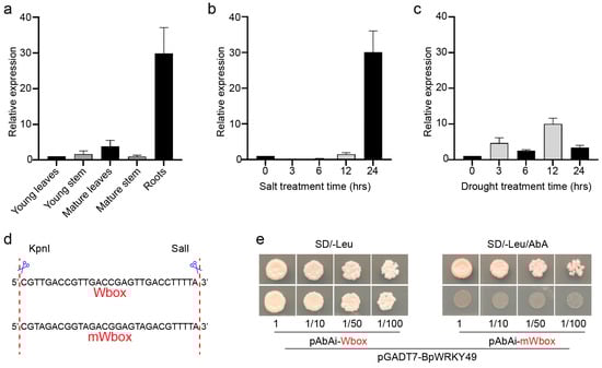 Expression analysis and binding of BpWRKY49 to W-box. (a) Tissue-specific expression of BpWRKY49 in young leaves, young stem, mature leaves, mature stem, and roots. (b,c) Expression pattern of BpWRKY49 during salt and drought treatment, respectively. Data are mean ± SD of three replicates. (d) Sequence of three tandem copies of Wbox and mWbox elements. (e) DNA-binding assay using the 3× W-box or mW-box as bait. Yeast transformants carrying pGADT7-BpWRKY49 were diluted to 10-fold, 50-fold, and 100-fold and then grown on SD/-Leu (left) and SD/-Leu containing 600 ng/mL AbA (right), respectively.