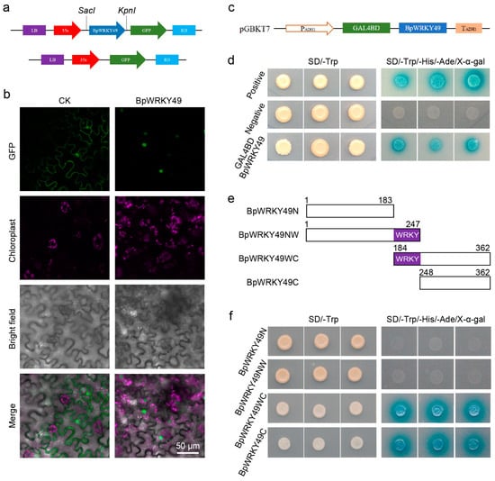 Subcellular localization and transactivation assay for BpWRKY49. (a) Schematic representation of constructs used for transformation of tobacco leaves. (b) Subcellular localization assay of the BpWRKY49 protein. Images showing the cells expressing GFP (control, left lane) or BpWRKY49:GFP (right lane) fusion protein, examined under fluorescent-field illumination (first line), chloroplast illumination (second line); bright-field illumination (third line); and an overlay of fluorescent, chloroplast, and bright illumination (fourth line). Scale bars, 50 µm. (c) Schematic representation of construct used for transaction assay of full-length BpWRKY49 protein. (d) Construct was transformed into yeast AH109 strain and examined on SD/-Trp and SD/-Trp/-Leu/-Ade/X-α-gal plates. (e) Schematic representation of different truncated versions of BpWRKY49 used in transactivation experiment. (f) Constructs were transformed into yeast strain AH109, and growth was observed on SD/-Trp and SD/-Trp/-His/-Ade/x-α-Gal.