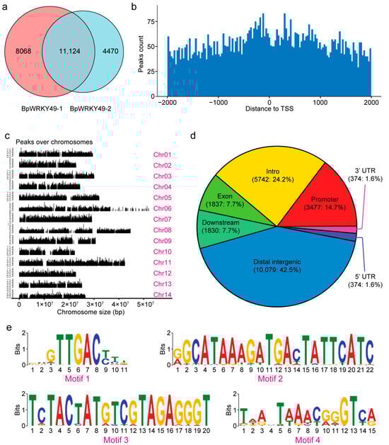 DAP-seq profile of BpWRKY49. (a) The BpWRKY49 transcription factor binding sites across two technical replicates. (b) The distance between the peak center and the TSS of the gene. (c) The BpWRKY49 binding peak distribution in 14 chromosomes. (d) DAP sequencing depth distribution of BpWRKY49. (e) The significantly enriched motif sequence of BpWRKY49 binding sites.