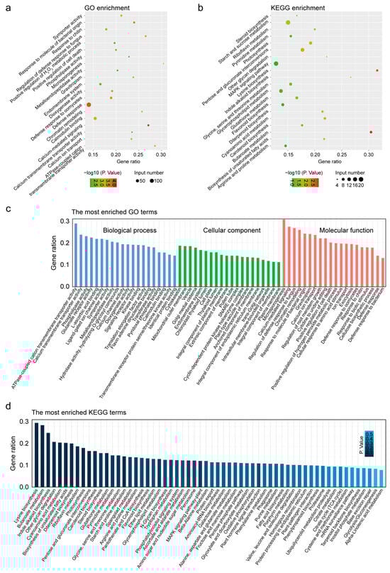GO enrichment and KEGG enrichment analysis of peaks of BpWRKY49. (a) GO enrichment map of targets of BpWRKY49 identified by DAP-seq. (b) KEGG enrichment map of target of BpWRKY49 identified by DAP-seq. (c) GO enrichment analysis of targets of BpWRKY49 showing most enriched GO terms. (d) KEGG enrichment analysis of targets of BpWRKY49 showing the most enriched KEGG terms.