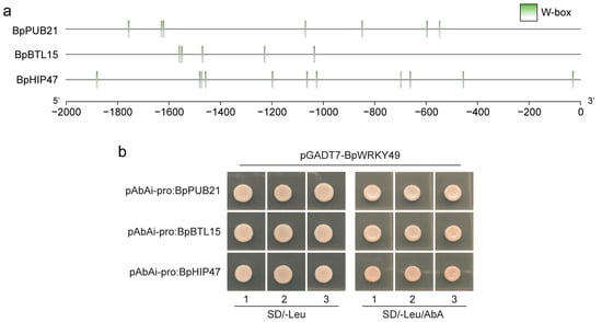 Binding of BpWRKY49 to the promoter of target genes using Y1H system. (a) Distribution of W-box elements in the promoter of BpPUB21, BpBTL15, and BpHIP47 genes. (b) Yeast cells with promoter fragments of three genes ligated into pAbAi vector were used as bait. pGADT7-BpWRKY49 was transformed independently into yeast cells carrying bait plasmids and were allowed to grow on SD/-Leu (left) and SD/-Leu with AbA (right); 1, 2, 3 show three replicates for each transformant.