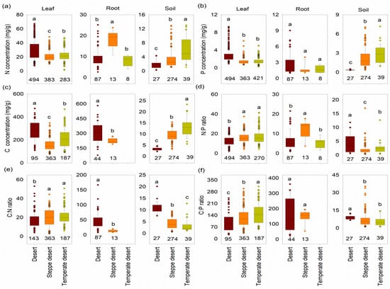 Comparisons of the nitrogen (N), phosphorus (P), and carbon (C) concentrations and their stoichiometric ratios in the leaves, roots, and soil of three ecosystem types (e.g., desert, steppe desert, and temperate desert). Here, (a–c) show the N concentrations, P concentrations, and C concentrations and (d–f) show the N:P, C:N, and C:P ratios, respectively, in two organs (e.g., leaves and roots) and in soil when all growth forms (e.g., herbs, shrubs, trees, and grasses) were pooled together. The different letters in each graph indicate significant differences among the three ecosystem types and differences in elements among leaves, roots, and soil (one-way ANOVA, p < 0.05). The numbers (n) under the box plot represent the number of species in each group.