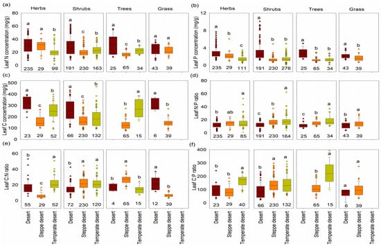 Comparisons of the nitrogen (N), phosphorus (P), and carbon (C) concentrations and their stoichiometric ratios in the leaves of plants with different growth forms (e.g., herbs, shrubs, trees, and grasses) among the three ecosystem types (e.g., desert, steppe desert, and temperate desert). Here, (a–c) show the N concentrations, P concentrations, and C concentrations and (d–f) show the N:P, C:N, and C:P ratios, respectively, in leaves. The different letters in each graph indicate significant differences in the elements across the three ecosystem types and among growth forms (one-way ANOVA, p < 0.05). The numbers (n) under the box plot indicate the number of species in each group.