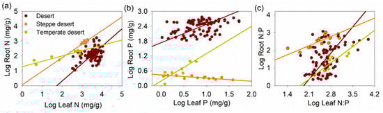 Scaling relationships of the nitrogen (N) and phosphorus (P) concentrations and N:P ratios between roots and leaves among the three vegetative types (e.g., desert, steppe desert, and temperate desert). The results of the reduced major axis (RMA) regressions are shown as comparisons between root and leaf N (a), between root and leaf P (b), and between root and leaf N:P ratios (c) across desert, steppe desert, and temperate desert ecosystems. All the results are described in Table 1.