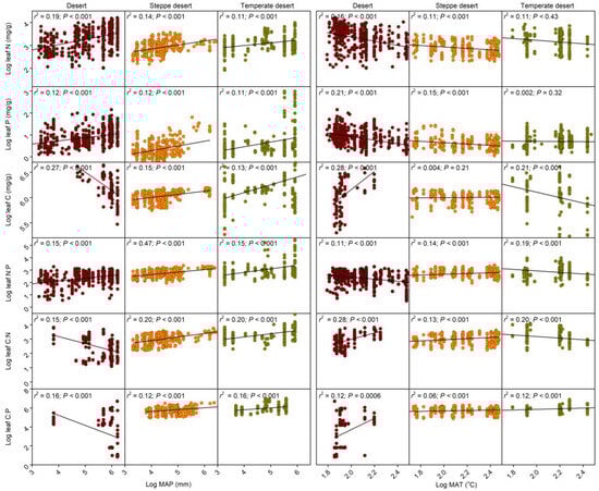 Furthermore, compared with those of MAP, the leaf N:P ratios were weakly related to MAT across the three desert ecosystems. The leaf C:N and C:P ratios showed negative relationships with MAP and positive relationships with MAT in the desert, while positive relationships of leaf C:N and C:P ratios with MAP and the leaf C:N and C:P ratios remained constant with increasing temperature in the steppe desert and temperate desert. The steppe desert showed weak relationships (r2 = 0.06, p < 0.001) compared with the other desert ecosystems.