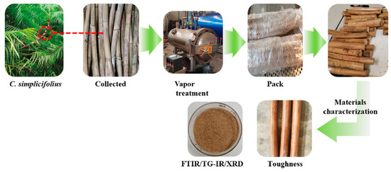 C. simplicifolius was collected from a plantation located in Pingxiang City, Guangxi, China. Three mature and defect-free rattan stems, with an average diameter (D) of 20 mm, were carefully selected for sampling. Stem samples of 60 cm in length were obtained from the central sections of the canes.