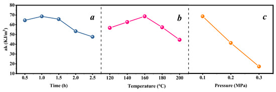Single-factor experiments were conducted to optimize the variables within desired limits. The impact toughness of the samples was evaluated for the steam heat treatment temperatures of 120, 140, 160, 180, and 200 °C at a fixed heat treatment time of 1 h and a fixed pressure of 0.1 MPa. Furthermore, the influence of heat treatment time on impact toughness was analyzed for durations of 0.5, 1, 1.5, 2, and 2.5 h at a fixed temperature of 160 °C and a fixed pressure of 0.1 MPa. To investigate the effect of pressure on impact toughness, three different levels of pressure (0.1, 0.2, and 0.3 MPa) were selected while keeping the heat treatment temperature constant at 160 °C for a duration of 1 h.