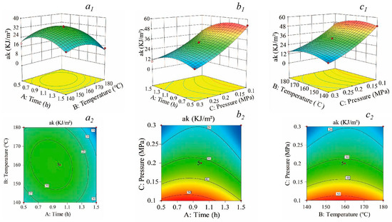 Three-dimensional surface and contour plots indicating the effects on impact toughness. (a1,a2) The effects of time and temperature; (b1,b2) the effects of time and pressure; (c1,c2) the effects of temperature and pressure.