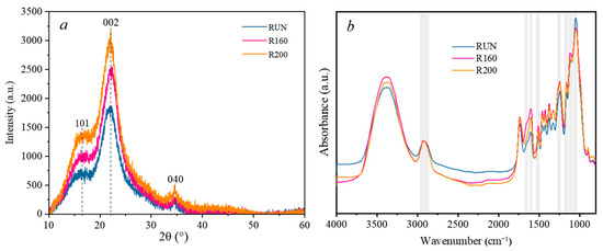 To investigate the impact of heat treatment on the chemical composition of C. Simplicifolius, we analyzed samples subjected to the optimal heat treatment conditions (R160), untreated samples (RUN), and samples treated at the highest temperature (R200) for 1 h under a pressure of 0.1 MPa. The results from the chemical composition analysis show that cellulose content and hemicellulose content decrease with increasing treatment temperature (Table 4). Similar findings were reported by Li et al. (2018) [12]. Additionally, there are no significant differences in cellulose content and hemicellulose content between samples treated at 160 °C and 200 °C. The increase in lignin content observed in the treated samples may be attributed to treatment-induced condensation and cross-link reactions of lignin or the production of compounds containing aromatic ring products [34]. Both R160 and R200 exhibit a higher lignin content compared to RUN. Generally, an elevation in temperature leads to a gradual increase in the lignin mass fraction accompanied by a simultaneous decrease in carbohydrate content [35]. Furthermore, the heat-treated samples show an increased alcohol-benzene extractive content compared to the untreated samples, with R200 exhibiting a higher level than R160. This trend is consistent with changes observed in lignin content.