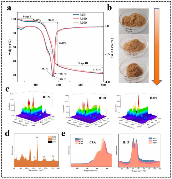Pyrolysis characteristics of three samples. (a) TG and DTG curves; (b) optical photograph; (c) 3D infrared spectra of pyrolysis gases; (d) single infrared spectra of pyrolysis gases at 352 °C, 354 °C, and 361 °C, respectively; (e) FTIR spectrum of CO2 and H2O with temperature.