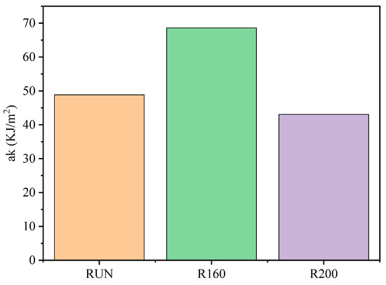 The increase in crystallinity theoretically leads to an increase in mechanical strength, such as bending properties, impact toughness, etc. Heat treatment will also lead to the decomposition of chemical components, so the change in mechanical properties is the result of the comprehensive action after heat treatment. After heat treatment, the impact toughness of the R160 sample increased to a certain extent compared with that of the RUN sample, while the impact toughness of the R200 sample decreased significantly (Figure 6). This result can be considered as the joint effect of the change in cellulose crystallinity and chemical composition content. When the heat treatment temperature is low, it is mainly the crystallinity of cellulose that plays a major role in enhancing the mechanical strength. With the increase in temperature, hemicellulose and cellulose degrade, and lignin content increases, which makes the brittleness of the single-leaf canina strengthen, and thus the impact toughness decreases.