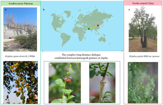 Source of Grafting Materials. The grafting experiments were carried out using Ziziphus spina-christi (L.) Willd. from Gwadar port area in southwestern Pakistan near the Arabian Sea and Ziziphus jujuba Mill. var. Spinosa from Zanhuang County, Hebei Province, north-central China. (a) Jujube of Ziziphus jujuba Mill. var. spinosa. (b) Geographical location of the source of experimental materials, the green dot represents the location of the Gwadar port area in Pakistan, and the red dot represents the location of Hebei Province in China. (c) Jujube of Ziziphus jujuba Mill. var. Spinosa. (d) Fruit of Ziziphus spina-christi (L.) Willd. (e,f) Heterografting of Ziziphus spina-christi (L.) Willd. and Ziziphus jujuba Mill. var. spinosa. (g) Fruit of Ziziphus jujuba Mill. var. spinosa.