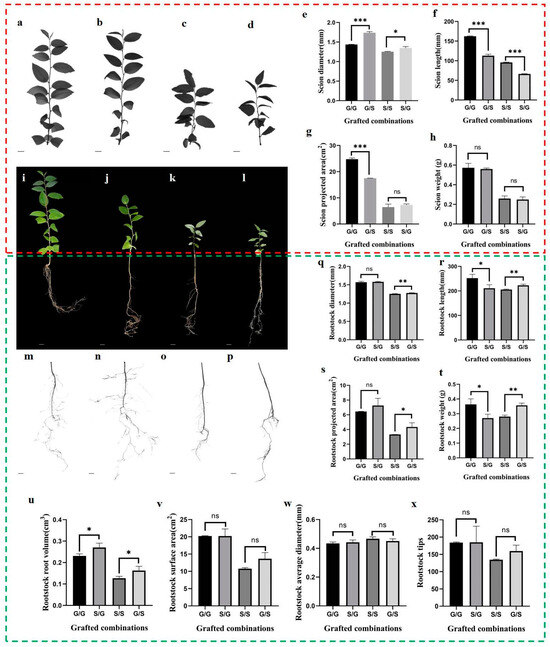 Early effects of heterograft in comparison with homograft. (a–d) Scanning of G/G_scion, G/S_scion, S/S_scion, S/G_scion. Scale bars, 1 cm. (e–h) Effect of heterograft on scion diameter, length, projected area, and weight compared with homograft. (i–l) Growth of grafted seedlings, G/G, G/S, S/S, S/G. Scale bars, 1 cm. (m–p) Scanning of G/G_rootstock, S/G_rootstock, S/S_rootstock, G/S_rootstock. Scale bars, 1 cm. (q–x) Effect of heterograft on rootstock diameter, length, projected area, and weight compared with homograft. Statistical significance was determined by Student’s t-test and the data are shown as mean ± standard deviation (n = 3). (Significance codes: *** represents significant at a p < 0.001 threshold, ** represents significant at a p < 0.01 threshold, * represents significant at a p < 0.05 threshold, ns represents no significance).