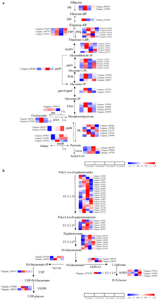 Analysis of DEGs in the pathways of carbon metabolism and pentose and glucuronate interconversion in the rootstock. (a) DEGs in the pathway of carbon metabolism. (b) DEGs in the pathway of pentose and glucuronate interconversion. The log2-transformed FPKM (fragments per kilobase of exon per million mapped reads) values represented by color scale. High expression represented by red color, and low expression represented by blue color.