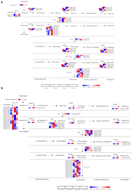 Analysis of DEGs in the pathways of phenylpropanoid biosynthesis. (a) DEGs in the phenylpropanoid biosynthesis pathway of scions. (b) DEGs in the phenylpropanoid biosynthesis pathway of rootstocks. The log2-transformed FPKM (fragments per kilobase of exon per million mapped reads) values represented by color scale. High expression represented by red color, and low expression represented by blue color.