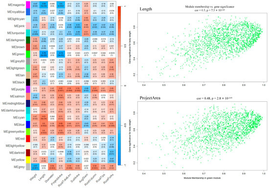 WGCNA to explore transcriptional regulation and expression of the molecular underpinnings of post-grafting plants. The heatmap indicated the correlation between modules and phenotypic data. The WGCNA R package (v4.3.2) was employed to construct gene co-expression networks. The parameters for the analysis were set as follows: powerEstimate at 16, maxBlockSize at 25,000, minModuleSize at 30, and mergeCutHeight at 0.25. A module—phenotype correlation heatmap was created using ggplot2 package in R. Within the “green” module, hub genes were selected based on GS1 and datKME values that exceeded 0.85.