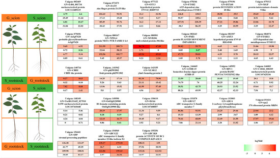 Our research also brings to the fore the substantial role that scions play in shaping rootstock characteristics. Notably, we observed a predominant upregulation of genes related to ABC transporters, specifically “ABC transporter G family member 22-like isoform X1” and “ABC transporter G family member 7”, in the scion following the grafting process. This upregulation suggests a potential enhancement in nutrient absorption and stress resilience, thereby contributing to the overall vigor of the grafted plant [67,68]. Additionally, we noted an upregulation in proteins involved in metalloprotease activities, such as “ATP-dependent zinc metalloprotease FTSH 2, chloroplastic”. This observation implies a likely improvement in cellular repair mechanisms and protein turnover, thereby reinforcing the mutualistic advantages inherent in the grafting process [69].