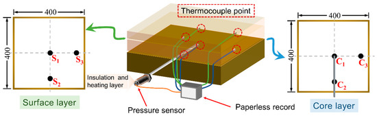 In this study, during the bamboo bundle paving process, six K-type thermocouple temperature sensors were placed at different locations: the center region of the slab surface layer (S1), the end region of the surface layer along the longitudinal direction (S2), the edge region of the surface layer along the transverse direction (S3), the center region of the slab core layer (C1), the end region of the core layer along the longitudinal direction (C2), and the edge region of the core layer along the transverse direction (C3). Additionally, a self-made press-monitor system was positioned at point C1 to measure the vapor pressure during the hot-pressing process [17]. The arrangements of the temperature sensors and vapor-pressure-measuring device are shown in Figure 2.