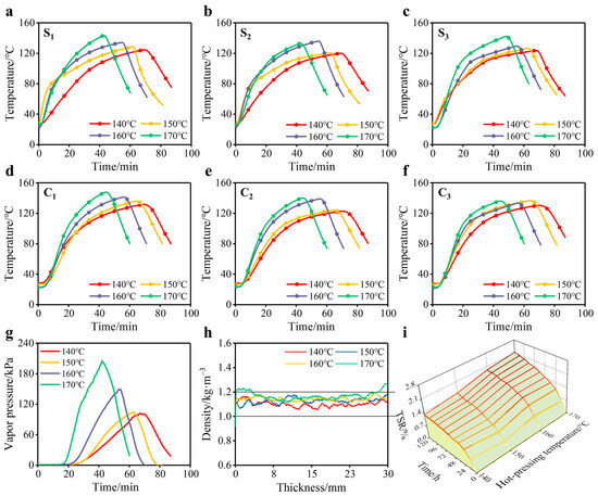 (a–f): The surface-layer and core-layer temperature changes of BBS treated with different hot-pressing temperatures; (g) vapor-pressure changes in the core layer of BBS treated with different hot-pressing temperatures; and (h,i) vertical density profile (VDP) and 120 h water-absorption TSR of bamboo scrimber treated with different hot-pressing temperatures.