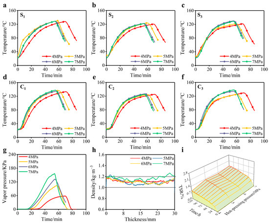 Figure 5g depicts that the emergence time of vapor pressure increased with increasing hot-pressing pressure. This occurred because, under increased hot-pressing pressure, the BBS was compressed to a compacted state earlier, leading to the blockage of vapor flow paths in all directions within the slab. As a result, vapor did not accumulate in the core layer [50]. Similarly, the ramp-up rate of the vapor-pressure curve also increased significantly with the increase in hot-pressing pressure. The ramp-up rates were 1.4 kPa/min, 2.7 kPa/min, 3.5 kPa/min, and 4 kPa/min for the BBS with hot-pressing pressures ranging from 4 MPa to 7 MPa, respectively. The phenomenon was attributable to the reduced porosity inside the BBSs at higher hot-pressing pressure. Furthermore, based on the ideal gas law, the vapor pressure inside the slab increased significantly when the hot-pressing temperature was unchanged, decreasing the pore volume [30,35]. Additionally, the premature compaction of the slab under the high hot-pressing loading made it difficult for vapor to escape from the BBS during the hot-pressing process. Thus, the peak vapor pressure increases as the hot-pressing pressure increases. This led to the BBS exhibiting some vapor pressures of 6 MPa and 7 MPa at the end of the hot-pressing process.