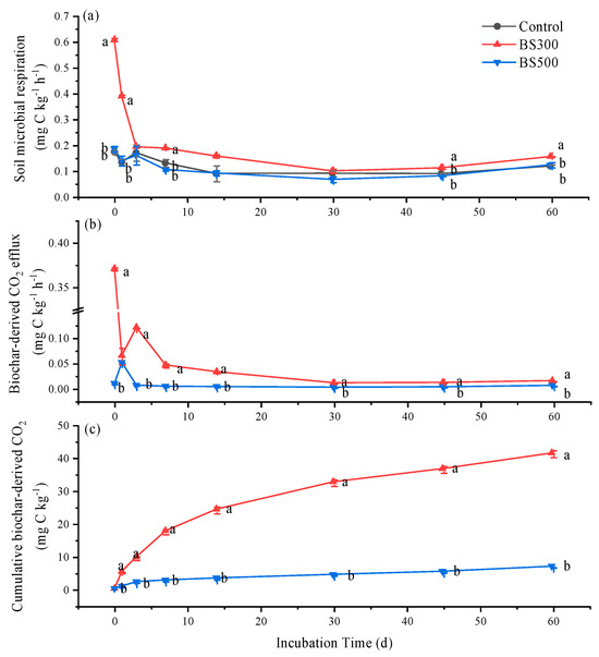 Temporal variations of microbial respiration (a), and carbon dioxide (CO2) efflux (b) and cumulative emission (c) derived from biochars pyrolyzed at 300 °C (BS300) and 500 °C (BS500) amended to the poplar soil during 60 days of incubation. The different lowercase letters represent significant differences between treatments on the same incubation time (p < 0.05). The vertical error bars indicate the standard error (n = 3).