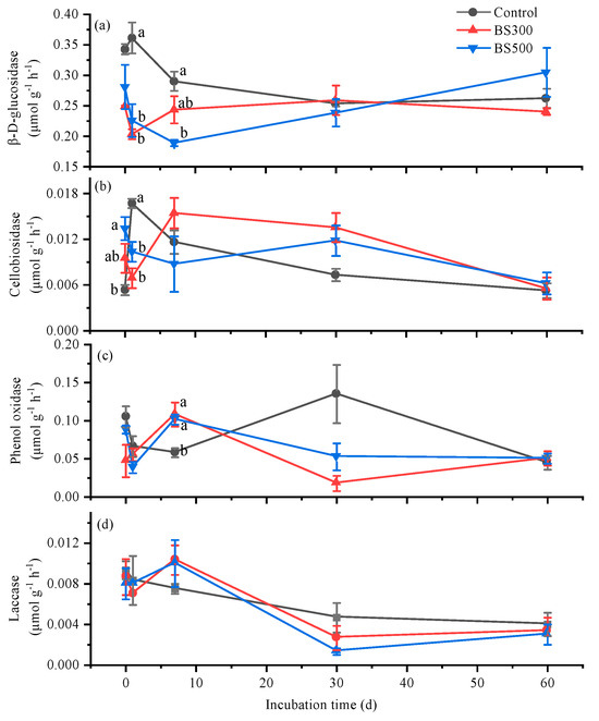 Temporal variations of β-D-glucosidase (a), cellobiosidase (b), laccase (c), and phenol oxidase (d) activity in soils without (Control) and with biochar pyrolyzed at 300 °C (BS300) and 500 °C (BS500) during 60 days of incubation. The different lowercase letters represent significant differences between treatments at the same incubation time (p < 0.05). The vertical error bars indicate the standard error (n = 3).