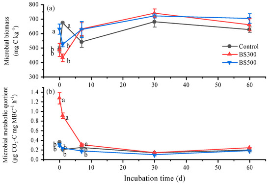 Temporal variations of microbial biomass (a) and metabolic quotient (b) in soils without (Control) and with biochar pyrolyzed at 300 °C (BS300) and 500 °C (BS500) during 60 days of incubation. The different lowercase letters represent significant differences between treatments on the same incubation time (p < 0.05). The vertical error bars indicate the standard error (n = 3).