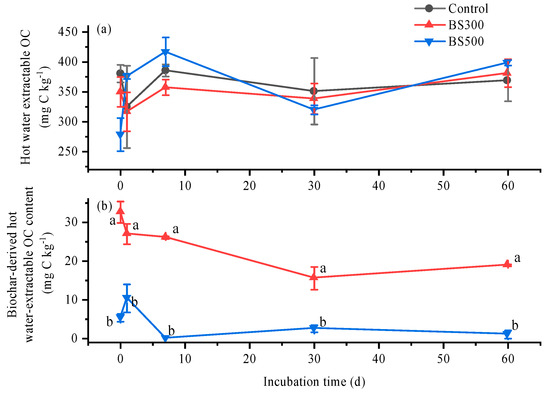 Temporal variations of the total (a), as well as biochar-derived (b), hot water-extractable organic carbon (OC) contents in soils with biochar pyrolyzed at 300 °C (BS300) and 500 °C (BS500) during 60 days of incubation. The different lowercase letters represent significant differences between treatments on the same incubation time (p < 0.05). The vertical error bars indicate the standard error (n = 3).