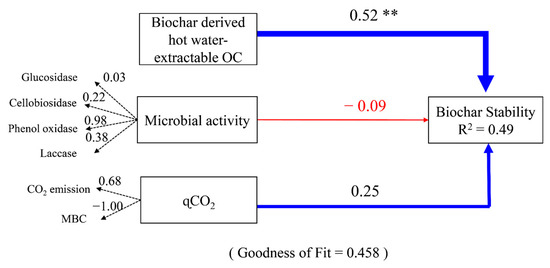 Partial least-squares path model (PLS-PM) illustrating the effects of soil microbial activity, metabolic quotient (qCO2), and biochar-derived hot-water-extractable organic carbon (OC) on biochar stability in soils. The path coefficients are calculated after 1000 bootstraps and are reflected in the width of the arrows, with blue and red arrows indicating positive and negative effects, respectively. The path coefficients indicated by ** represent significant difference from 0 at p < 0.01. R2 indicates the proportion of variance explained for the latent variable of biochar stability. The numbers on the dashed arrows are the loading scores of the observed variables that create the latent variables. The PLS-PM is assessed using the Goodness of Fit statistic (0.458). CO2 and MBC represent carbon dioxide and soil microbial biomass carbon, respectively.