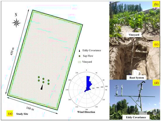 Overview of the research area. (a) Location of the study site. (b) Vineyard. (c) Root distribution. (d) Equipment used for meteorological measurements.