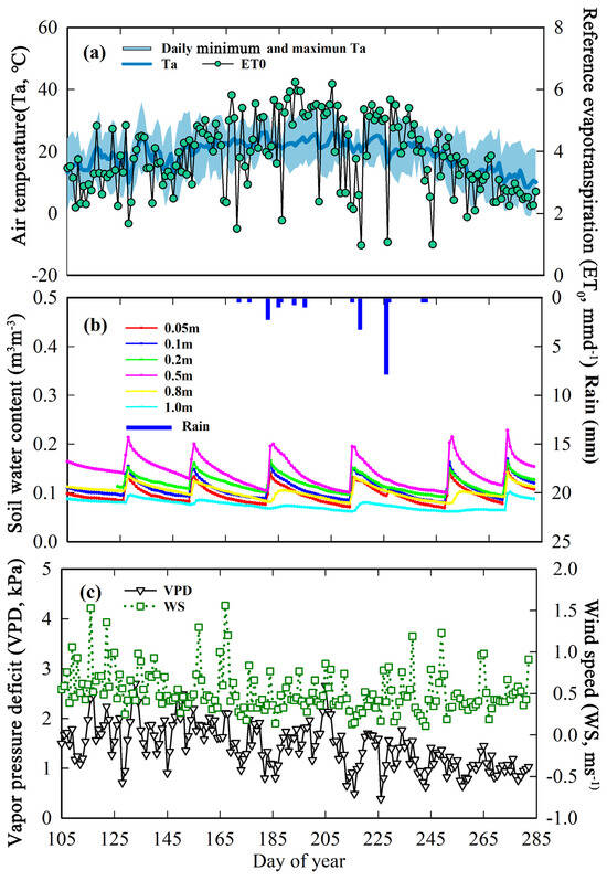 Seasonal variation in daily hydrological and meteorological factors in 2018 during the study period. (a) ET0 (mm d−1) and Ta (°C). (b) Rainfall (mm) and VWC (m3m−3). (c) VPD (kPa) and WS (ms−1).