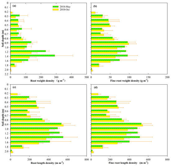 Vertical distribution of the root (fine root) weight (length) density. (a) Root weight density in May and October. (b) Fine root weight density in May and October. (c) Root length density in May and October. (d) Fine root length density in May and October.
