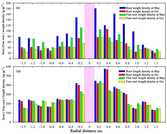 Horizontal distribution of the root and fine root weight and length density. (a) Root weight density of total and fine roots in May and October. (b) Root length density of total and fine roots in May and October.