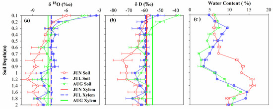 Figure 5 shows the δD and δ18O isotopes at different soil depths and corresponding plant stems from June to August. The results of δ18O isotopes were primarily focused on in this study area and may be attributed to δD isotopes being more sensitive to the environment compared to δ18O isotopes, which may give rise to considerable uncertainty as described by Qiu et al. [22]. The soil water δD and δ18O isotopes values obviously differed during the growing stages and changed with the soil depth in 2018 (Figure 5a,b). The δ18O in the soil water ranged from −9.46 to −5.95‰, −8.57 to −3.28‰, and −8.29 to −4.35‰, with average values of −8.25‰, −7.24‰, and −7.32‰ in June, July, and August, respectively (Figure 5a). Meanwhile, the δD in soil water ranged from −73.99 to −57.56‰, −67.65 to −51.47‰, and −65.59 to −38.33‰, with average values of −65.61‰, −61.11‰, and −58.05‰ in June, July, and August, respectively (Figure 5b). The values of δD and δ18O of soil water in the shallow soil profiles (0–40 cm) seemed enriched compared with that of the deeper soil water in the study area, likely because of the intense soil evaporation giving rise to isotopic enrichment, as suggested by Wang et al. [23]. By and large, the soil water isotopic compositions synthesized the processes associated with soil evaporation, rainfall, irrigation, and antecedent moisture [23,60]. These noticeable variations in isotopic soil water depth are the basis for the use of isotopic means to evaluate the possible sources of soil water consumed by plants, as reported in Wang et al. [28].
