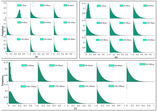 The histogram patterns for the shallow depths below the ground surface (0–40 cm) are relatively straightforward, while patterns at deep profiles below the ground surface are more diffuse (Figure 6a), suggesting that the soil water from 0 to 40 cm contributes 67.2% in June for vines (Vitis vinifera L.). Similarly, vines (Vitis vinifera L.) primarily consumed water from the 20–80 cm layer in July, accounting for 39.7% of the total water uptake (Figure 6b) and from the 40–100 cm layer in August, accounting for 38.3% of the total water uptake (Figure 6c).