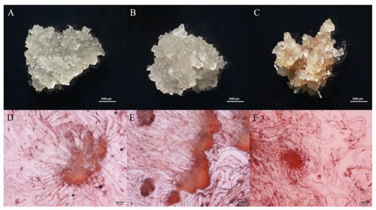 Embryogenic tissue and staining of three embryogenic lines. (A,D) BFU1, (B,E) BFU3, (C,F) BFU8. Bars (A–C) = 1000 µm, (D–F) = 50 µm.