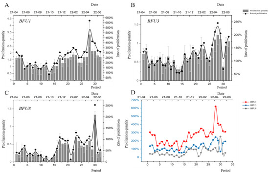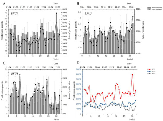 Proliferation Analysis and Comparison of BFU1, BFU3, and BFU8 Cell Lines. (A–C) Proliferation weight and rate of BFU1, BFU3, and BFU8. (D) Comparison of proliferation rates of BFU1, BFU3, and BFU8.