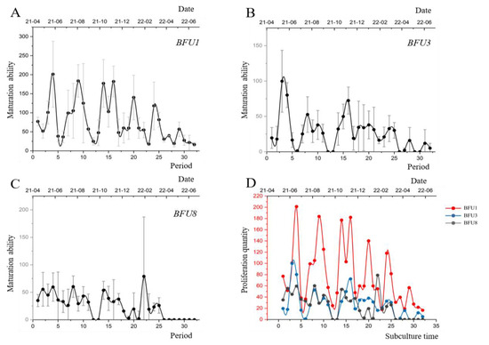Maturity Capacity Analysis of BFU1, BFU3, and BFU8 Cell Lines. (A–C) Maturity capacity of BFU1, BFU3, and BFU8. (D) Comparison of maturity capacity of BFU1, BFU3, and BFU8.