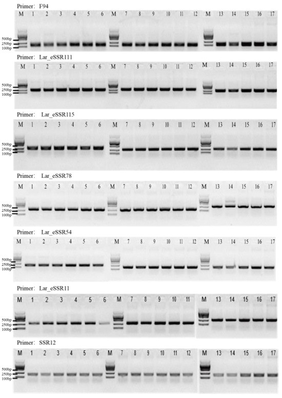 Separation of different primers in embryogenic tissues of Prince Rupprecht’s larch at Different Stages. (1–6 are tissue sample from the 1st, 7th, 17th, 25th, and 32nd cycles of BFU1 and continuously cultivated for two years; 7–12 are tissue sample from the 1st, 7th, 17th, 25th, and 32nd cycles of BFU3 and continuously cultivated for two years; 13–17 are tissue samples from the 1st, 7th, 17th, 25th, and 32nd cycles of BFU8; M is the marker).