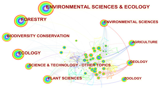 Recent technological advancements have caused academic boundaries to be dismantled and rebuilt, and interdisciplinary study is now widely acknowledged as a means of advancing science and technology [23]. To investigate the interdisciplinary status of field knowledge linked to forest ecological benefit compensation, this study involved building a multidisciplinary network based on the Web of Science database and integrating it with an interdisciplinary co-occurrence analysis diagram (Figure 2).