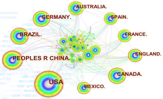As of 20 March 2022, the color of the outer ring of each node in Figure 3 corresponds to the total number of publications (the same below). The results showed that forest ecological benefit compensation research primarily occurred in 10 countries: the United States, China, Brazil, Canada, Germany, Australia, Spain, England, France, and Mexico (Figure 3; Table 2). European countries have conducted more research and had more influence in this field than any other region, as four of the top 10 countries are European.