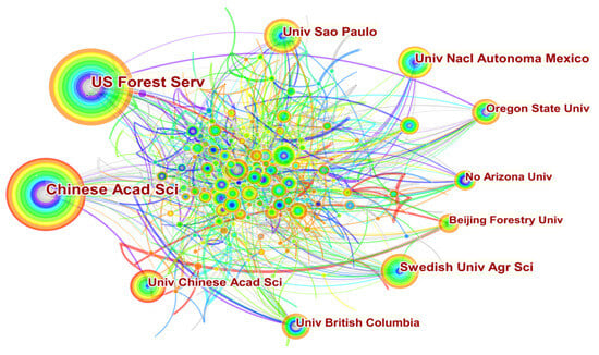 The global ranking of the top 10 scientific research organizations had an average of 94.1 articles published; however, only two scientific research institutions have published more than the average number of papers, namely the US Forest Service in the United States, which ranked first with 218 articles, and the Academy of Sciences, a Chinese institution located in China, which ranked second with 203 articles (Table 3). The US Forest Service, the Chinese Academy of Sciences, and the University of São Paulo ranked first, second, and third, respectively, among scientific institutions based on total citation metrics. In terms of average citations, the University of São Paulo in Brazil reached 30.61, followed by the US Forest Service in the United States with 25.11; the Swedish University of Agricultural Sciences in Sweden ranked third, with 23.86, and Oregon State University in the US ranked fourth, with 23.82. The Swedish University of Agricultural Sciences was thus only 0.04 units higher than the Oregon State University in the US.