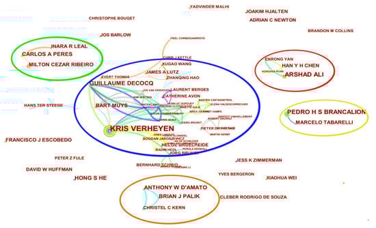 - With 24 publications, the Kris Verheyen research team (circled in blue in Figure 5) had the largest number of publications. Authors with the most intimate ties and collaborations included Kris Verheyen, Guillaume Decocq, and Bart Muys. It is evident from the color of the links between the nodes that the collaboration between these three authors was most active in 2015 and 2019. Verheyen et al. concentrated on the effects of climate change, land, and forest biodiversity [24,25,26,27].
