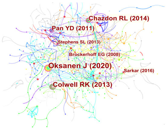 In conjunction with Figure 6, co-citations at high frequency were considered and the results in order of central size showed that RK Colwell from Finland came in second place: “Site types revisited: Comparison of traditional Russian and Finnish classification systems for European boreal forests”, published in 2021 [43]. This article provides a significant review of forest types and forest species. In third place was J Oksanen from the United States, with “vegan: Community Ecology Package”, which focuses on planted forests and biodiversity, published in 2013. The centrality of the remaining four articles was also strong, with a value of 0.11. The literature indicated that scholars have focused on the topic of “forest biodiversity”.